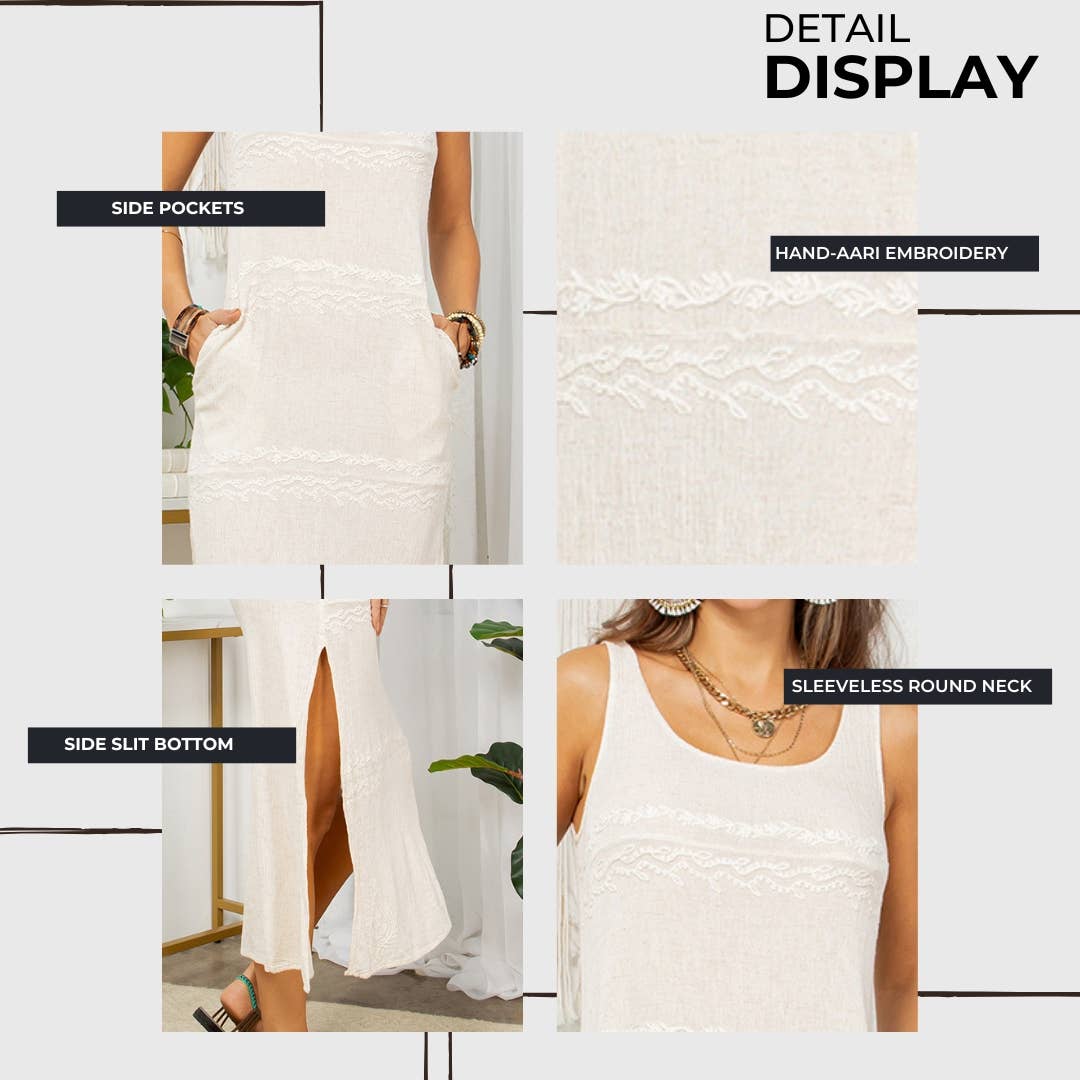 Embrace the earthy whisper of nature in this captivating long dress, where hand-aari embroidery dances on cider hues, transporting you to a 60s bohemian dream. Flowing sleeveless silhouette: Keeps you cool and showcases your sun-kissed skin. Split front design: Adds movement and a touch of flirtatiousness. Hand-aari embroidery panels: Intricate artistry tells stories on natural flax panels, adding depth and cultural flair. Rayon flax linen blend: Soft and breathable fabric, offering a touch of rustic elegance and connection to nature. Cider hue: Earthy and warm, reminiscent of sun-kissed fields and autumnal sunsets. Draped fit: Hugs your curves in a flattering and comfortable way. Functional side pockets: Keep your essentials close at hand. Modern take on the 60s aesthetic: A timeless silhouette infused with contemporary boho vibes.